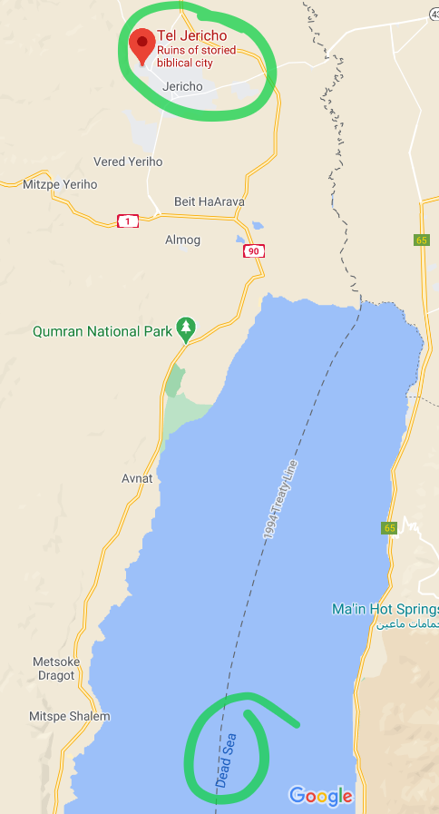 Just like the Bible says, Jericho really is located near the Dead Sea. A simple Google Maps search will confirm this. The site of ancient Jericho is located adjacent to the Dead Sea and the ruins can still be visited today by the public. Modern Jericho is about two miles away from the ruin site.